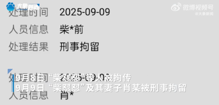 在查询页面中的“人员信息”部分显现:“柴怼怼”等人于9月8日被依法拘传,次日(9月9日),“柴怼怼”与其妻子肖某被刑事拘留。